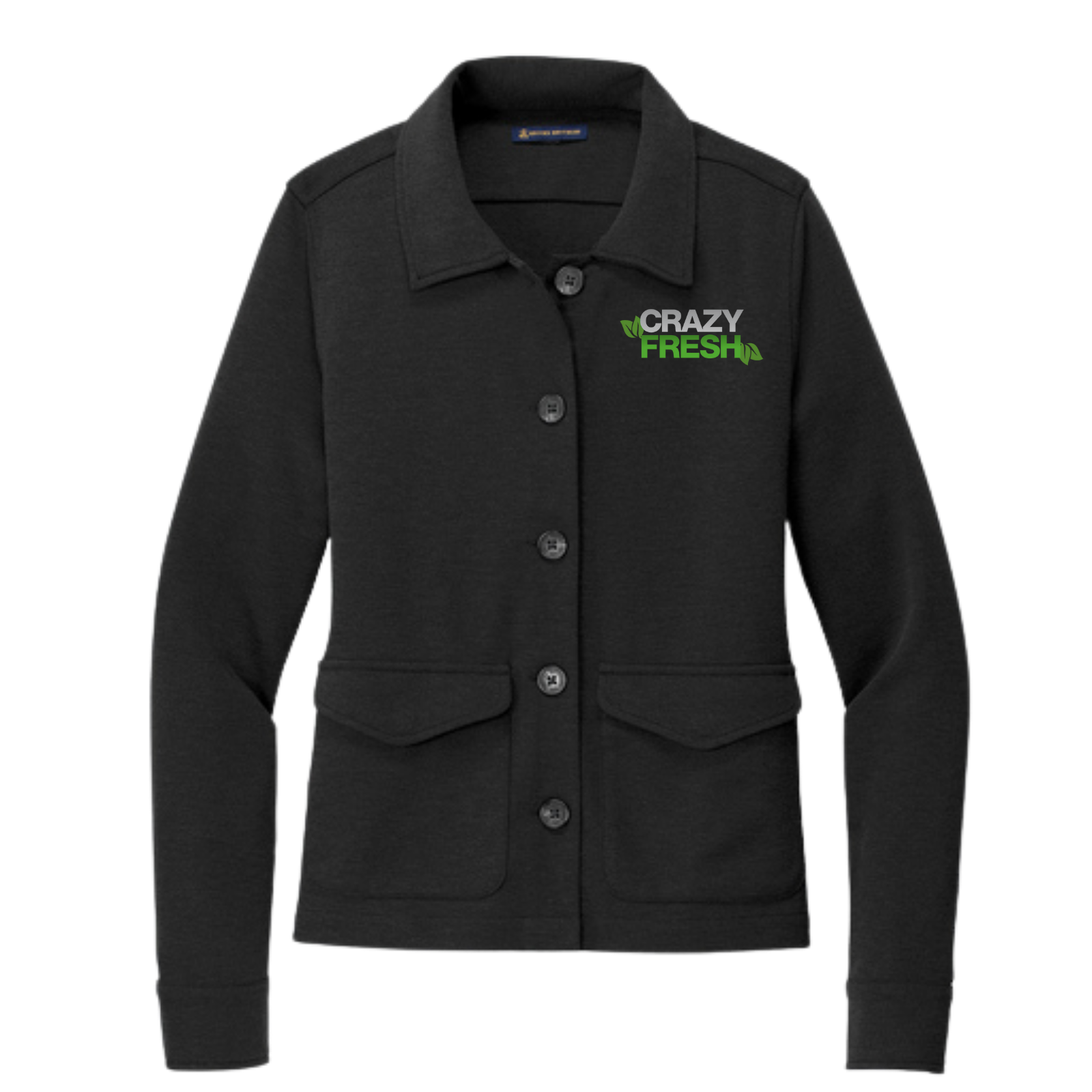 A structured double-knit style with a luxuriously soft hand, this versatile woman’s jacket adds a touch of utilitarian flair with a full button-front closure. The jacket can be cinched with a hidden waist drawcord for a more form-fitting look.